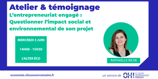 Monter son projet entrepreneurial en questionnant les conséquences de son activité sur son environnement : mission impossible ? Cet atelier vous prouve le contraire et vous emmène découvrir une diversité de modèles d'entrepreneuriat durable, engagé sur le territoire ou pour une cause sociale. On vous aide à vous repérer et on vous donne des pistes pour vous mettre en mouvement ! Cet atelier sera animé par Raphaëlle Riché de l’Ouvre-Boîtes et Lauriane Barthélémy des Ecossolies, et illustré par le témoignage de Yann Saligaut, dirigeant de l’association locale La Récupérette.